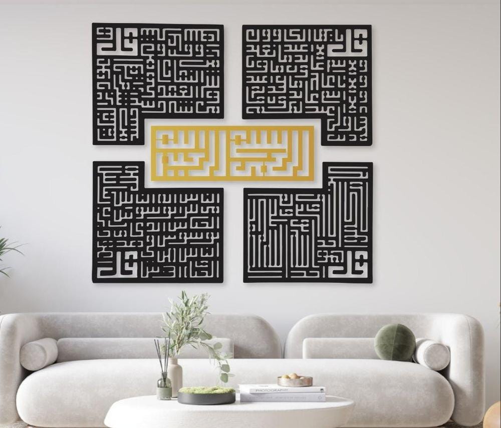The Four Qull With Golden Bismillah wall decor is a beautiful piece designed to add a touch of modern Islamic art to your home. Crafted with precision from durable 3mm MDF, it’s easy to install and brings both meaning and elegance to any room.